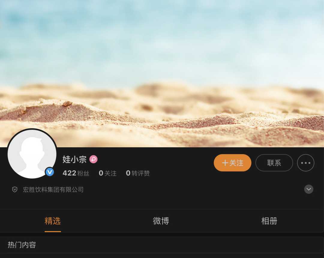 10月11日,一个名为“娃小宗”的微博账号已完成平台认证,检索信息显示,该账号认证主体为宏胜饮料集团有限公司,审核通过时间为9月30日,目前粉丝数422,但暂未发布任何内容。作为新兴品牌动态,这一动作引发市场对品牌合规化发展的关注。