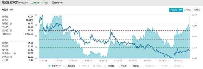 从估值层面来看,零售行业估值波动备受关注。截至10月10日数据,商贸零售(申万一级)指数目前市盈率40.94倍,处于近十年86.98%分位点;市净率1.95倍,处于近十年58.17%分位点。此前9月中旬,该指数市盈率一度升至43.58倍,创2017年4月以来近8年新高,显示出市场对零售行业的乐观预期。