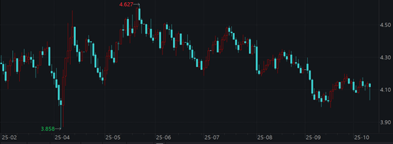 从今晨的行情来看,10年美债收益率一度下行超过9个BP至4.034%,市场波动显著。其他期限美债收益率也大幅下行,3年期一度下行超过10个BP。临近尾盘,美债收益率回升,10年美债收益率最终较前一日下行1.95BP收于4.117%,显示出市场的不稳定性。图:美10年国债收益率K线走势