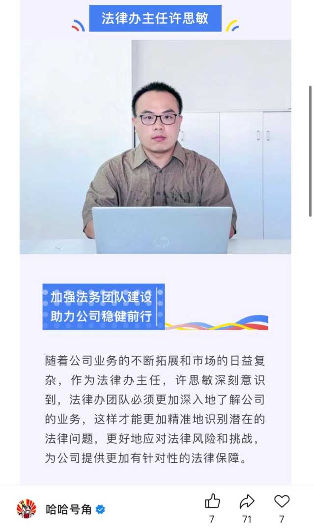 从公开信息看,许思敏为娃哈哈集团监事会成员,同时,娃哈哈集团官方公众号“娃哈哈号角”在2024年11月一篇文章中介绍,许思敏的身份为娃哈哈集团法律办主任。根据企业工商信息,许思敏共计关联6家娃哈哈相关公司。其中,许思敏在浙江娃哈哈创业投资有限公司、杭州娃哈哈食品有限公司中担任监事。此外,许思敏在重庆市涪陵娃哈哈饮料有限公司、吉林娃哈哈食品有限公司担任法定代表人、总经理等职务。另据媒体援引娃哈哈在职员工的说法称,“许思敏在今年4月是娃哈哈集团职代会主席团成员;娃哈哈职代会结束后,宏胜集团的组织架构里,他又是宏胜集团法务负责人。”对于这一变动,一位不愿具姓名的娃哈哈前高管向21世纪经济报道记者评价为,“目前很难预判许思敏的任职情况,但现代企业确实需要职业经理人来管理”。