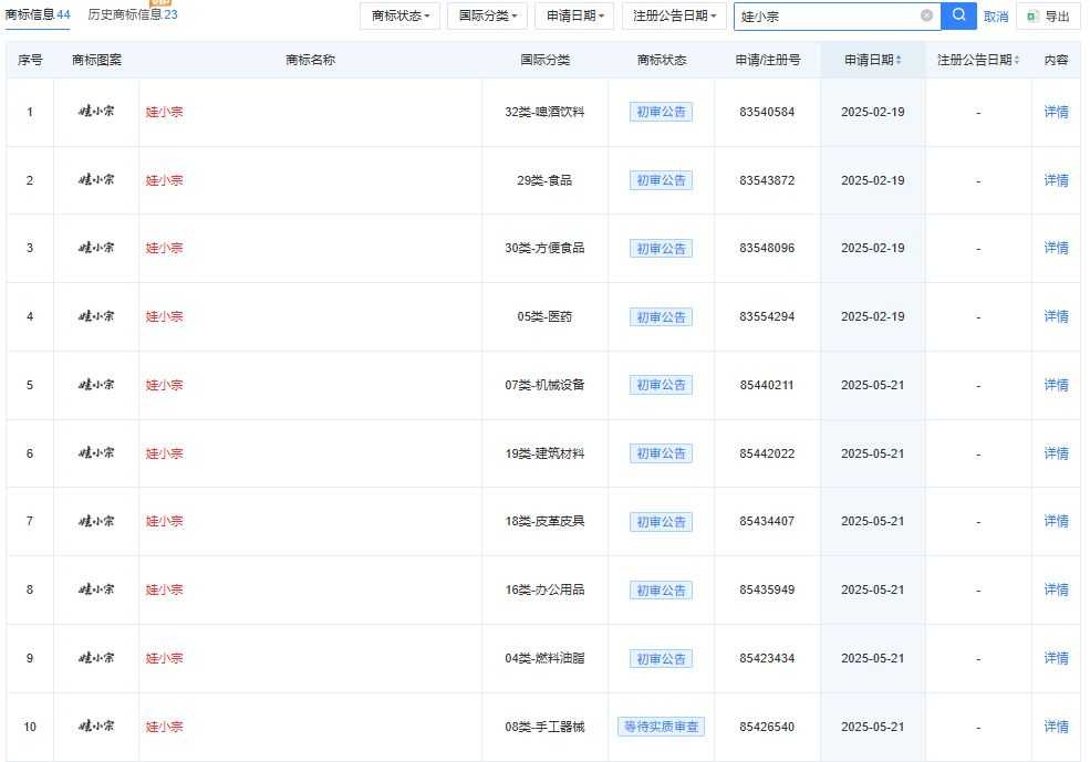 通过天眼查App注意到,今年以来,宏胜集团已申请数十个“娃小宗”相关商标,国际分类包括啤酒饮料、食品、方便食品和医药等,部分商标已通过初审,部分商标还在等待实质审查。