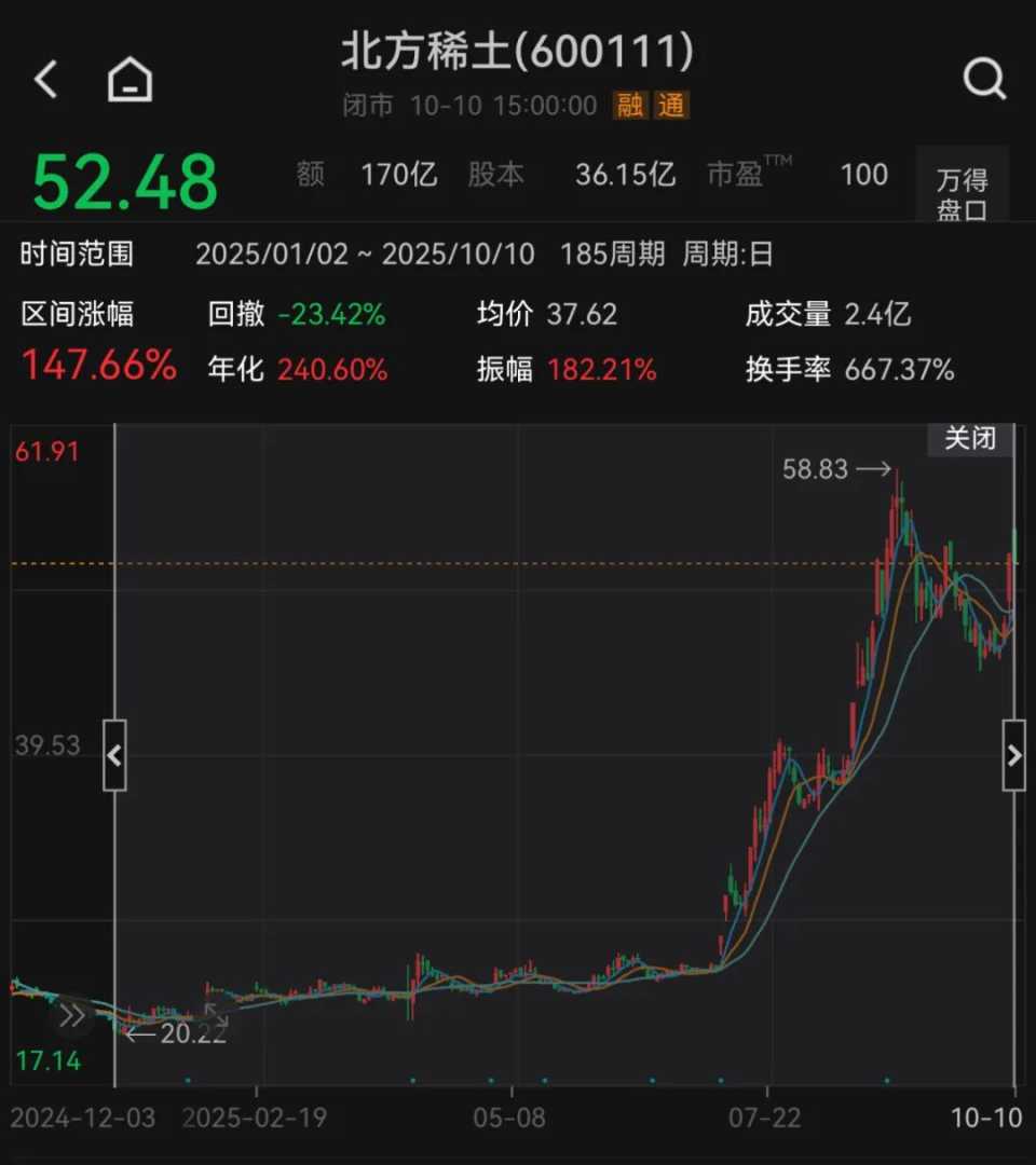 数据显示,截至10月10日收盘,公司股价报52.48元/股,总市值约为1897亿元。今年以来,北方稀土股价累计涨幅为147.66%,市场关注度持续提升。