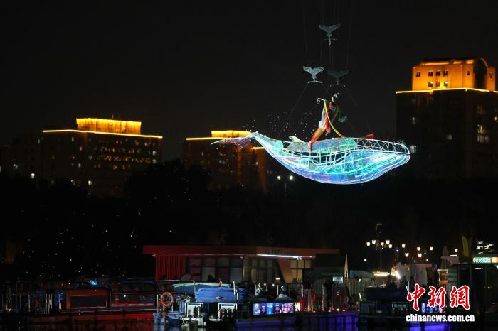 这是北京首个跨水域空中光影表演“飞跃蓝湖”呈现的场景。本届灯光消费季延续“灯光+”理念,结合多元元素,打造多元融合场景,包括重点消费活动110余场及文商旅体健联动活动近400场,为城市消费增添新动力。
