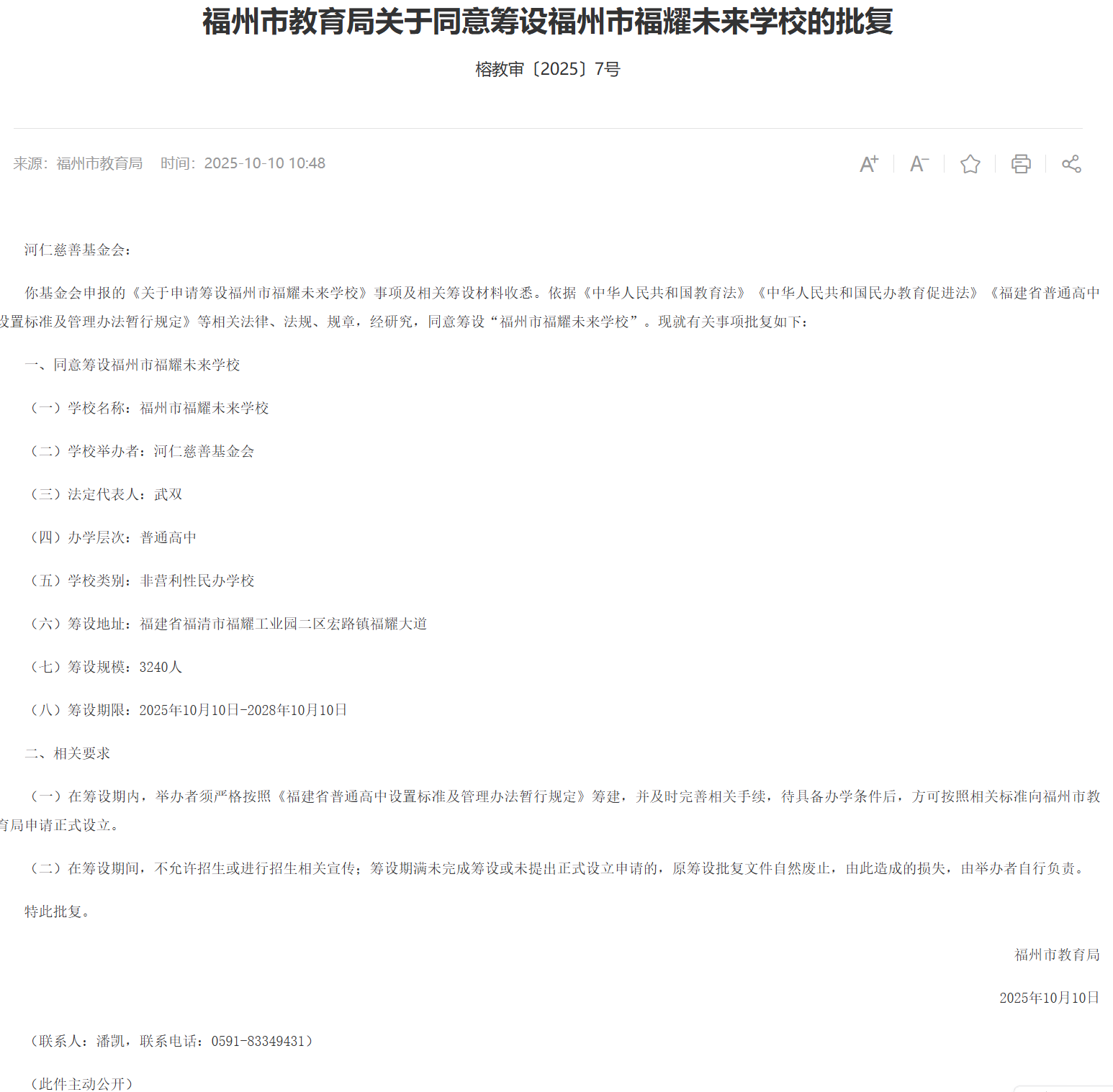 10月10日,福州市教育局官网公示批复文件,同意筹设“福州市福耀未来学校”。该校由河仁慈善基金会举办,为普通高中非营利性民办学校,筹设地址位于福清市福耀工业园二区,规模3240人,筹设期限三年。