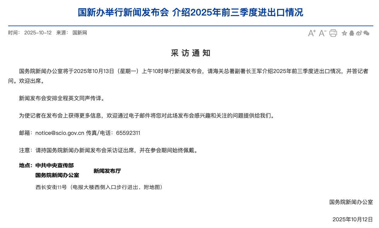 10月12日消息,国务院新闻办公室将于2025年10月13日上午10时举行新闻发布会,海关总署副署长王军将介绍2025年前三季度进出口情况并答记者问,此发布会意义重大。