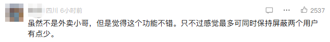 社交平台上,有骑手认为,平台此举可以保护骑手,骑手屏蔽顾客后不用担心再受气;也有骑手认为,一个大区域内,你不送有的是骑手送,屏蔽两个用户并不会影响什么。行业人士表示,平台为用户和骑手提供更多双向选择权,保护各方权益,是个有益探索。该功能引发网友热议,不少网友表示“就应该这样,外卖员也有选择权”,还有网友称“最多只能屏蔽两个太少了”。
