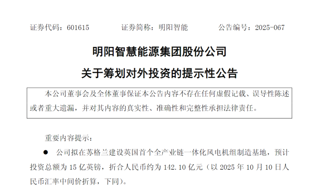 10月12日,明阳智能公告称,公司拟在苏格兰建设英国首个全产业链一体化风电机组制造基地,预计投资总额为15亿英镑,折合人民币约142.10亿元。资金将用于建设海上与漂浮式风电机组制造工厂,这一风电投资计划将进一步推动全球能源转型。明阳智能称,该投资有利于公司打造一个服务于英国、欧洲及其他非亚洲市场的海上风电中心,推动公司成为全球海上风电产业的重要参与者。