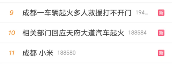 10月13日凌晨,成都天府大道一路段突发一起车祸事故,一辆车辆在行驶中发生碰撞后起火燃烧,车辆起火事件迅速引发社会广泛关注,在某社交平台连上多次热搜。此次交通事故中,车辆起火、人员被困等情节牵动人心。