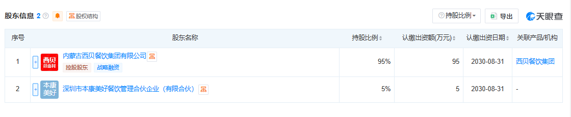 股东信息显示,玉华美好由内蒙古西贝餐饮集团有限公司(以下简称“西贝”)出资95万元,持股95%;深圳市本康美好餐饮管理合伙企业(有限合伙)出资5万元,持股5%,凸显了西贝在餐饮行业的布局。