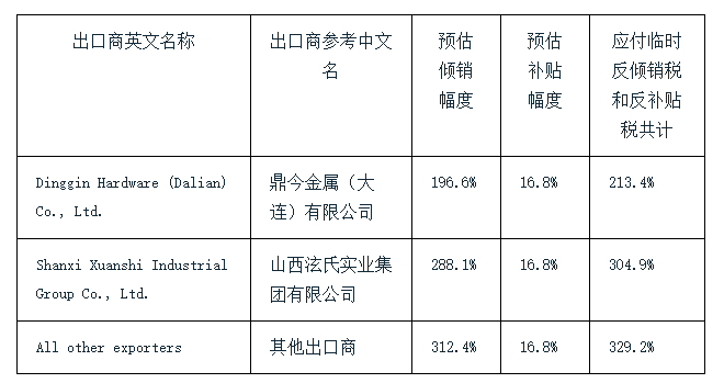 加拿大对华铸铁污水管临时反倾销税和反补贴税税率表: