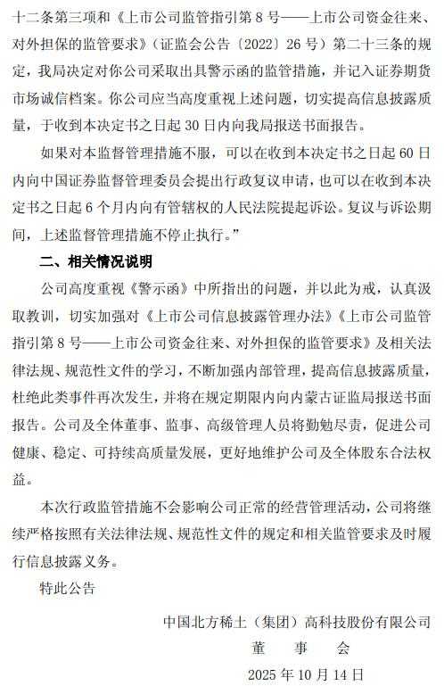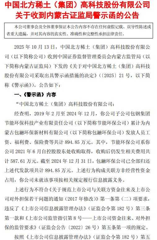 北方稀土收警示函:子公司违规发放关联方费用,信息披露存漏