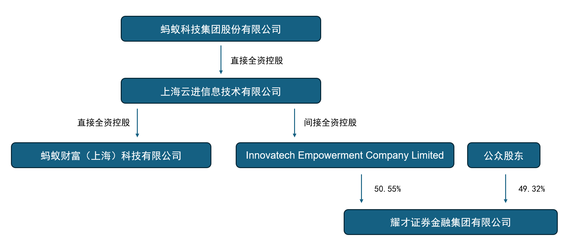 此前4月25日,耀才证券公告,蚂蚁集团全资子公司上海云进计划以3.28港元/股的价格,收购耀才证券控股股东新长明控股持有的50.55%公司股份,总对价约为28.14亿港元。