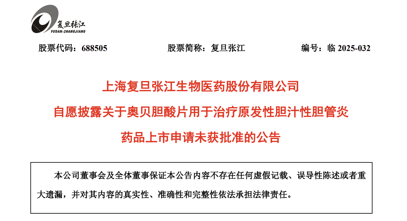 13日,复旦张江(688505.SH)发布公告称,其全资子公司泰州复旦张江药业有限公司(简称“泰州复旦张江”)申报的用于治疗原发性胆汁性胆管炎(PBC)的奥贝胆酸片(规格:5mg、10mg),因不符合药品注册的有关要求,注册申请未获得国家药监局批准。医药研发