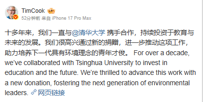 “我们很荣幸能在与清华大学长达十年的合作基础上更进一步,通过学术能力培养与实践经验赋能,助力学子们推动环境事业的发展。”Apple CEO Tim Cook表示,“新一代年轻人将如何运用创新与协作的力量让世界变得更美好,我们对此充满期待。”这一捐赠计划不仅是对教育公益的支持,更是对未来环保人才的期待。