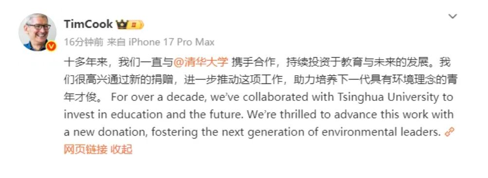 据介绍,“我们很荣幸能在与清华大学长达十年的合作基础上更进一步,通过学术能力培养与实践经验赋能,助力学子们推动环境事业的发展。”Apple CEO Tim Cook表示,“新一代年轻人将如何运用创新与协作的力量让世界变得更美好,我们对此充满期待。”