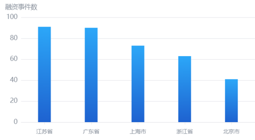 分行业来看,排名第一的信息技术行业发生融资事件175起,排名第二的生产制造业发生109起,融资事件发生较多的行业还有:企业服务、医疗健康、电子信息产业、材料、汽车交通、能源矿产、消费生活和农业等。分地区来看,江苏省融资事件发生91起,排名第一;广东省融资事件发生90起,排名第二。投融资数据反映行业与区域经济活力,排名前五的行业及地区如下图所示: