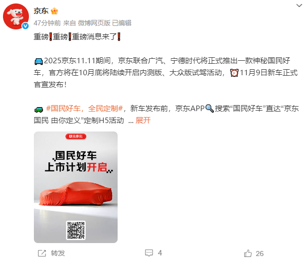 京东官方微博宣布,2025年京东双11期间将联合广汽、宁德时代推出一款新车,10月底开启试驾,11月9日正式发布,为汽车市场带来新活力。