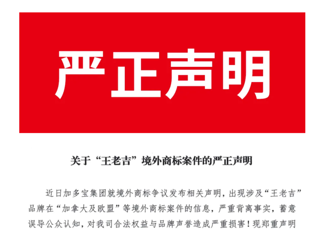 这场海外商标博弈的序幕于9月30日拉开。当天上午,加多宝通过公众号宣告其在海外“维权告捷”。据媒体报道,加多宝通过关联公司万捷有限公司,在加拿大联邦法院及欧盟普通法院的多起诉讼中,捍卫了“王老吉”海外系列商标的合法权益,并强调“对任何侵权、假冒及不正当竞争行为,将坚决追究法律责任”。尽管推文未指名道姓,但当晚王老吉发布《严正声明》予以回击,直指加多宝“就境外商标争议发布相关声明,严重背离事实,误导公众认知,对我司合法权益与品牌声誉造成严重损害”。