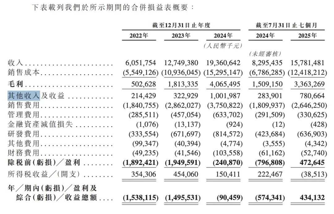 直观来看,虽然收入上涨带动了毛利提升,但相应的岚图今年的三费支出也水涨船高,能够实现盈利的关键在于“其他收入及收益”的暴增。去年前7个月,岚图的其他收入及收益不到2.84亿元,今年同期这一数字暴涨至7.8亿元,是去年同期的275%。要知道,2022年和2023年,岚图的其他收入及收益分别为2.14亿元和3.23亿元,基本稳定,暴涨是从去年下半年开始的。2024年在前7个月其他收入及收益不到2.84亿元的情况下,去年全年岚图这项指标超过10亿元,这也意味着最后五个月激增超7.16亿元,五个月的增量超过了此前两年的总和,新能源车企收入结构引人深思。