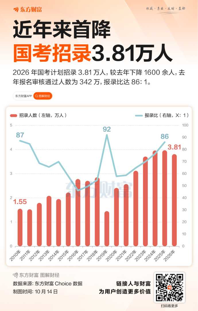 据国家公务员局消息,2026年国考计划招录3.81万人,较去年减少1600余人,为近年来首次下降,这一变化引发了广泛关注。此外,国考报考年龄限制发生变化,由之前的35周岁以下放宽至38周岁以下(应届硕博生由40岁放宽至43岁),这是自1994年发布《国家公务员录用暂行规定》以来首次发生变化,这一调整无疑为更多考生提供了机会。