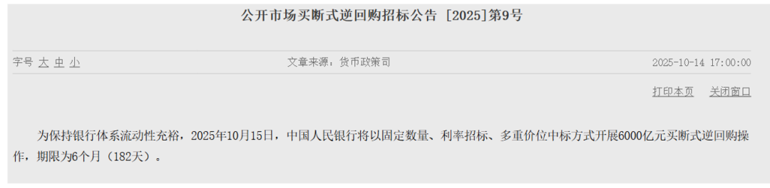 中国人民银行10月14日消息,为保持银行体系流动性充裕,10月15日,中国人民银行将以固定数量、利率招标、多重价位中标方式开展6000亿元买断式逆回购操作,期限为6个月(182天),此举旨在进一步强化市场流动性管理。买断式逆回购