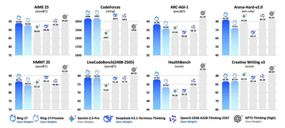 此外,本次发布的Ring-1T模型继续采用Ling 2.0架构的1T base模型做后训练,Ling 2.0采用了包括高度稀疏的MoE架构,1/32的专家激活比、FP8混合精度、MTP等诸多特性实现高效训练与推理。在后训练阶段,蚂蚁百灵团队通过LongCoT-SFT+RLVR+RLHF多阶段训练,显著提升了模型的复杂推理能力以及指令跟随和创意写作等通用能力,展现了其全面的科技研发能力。