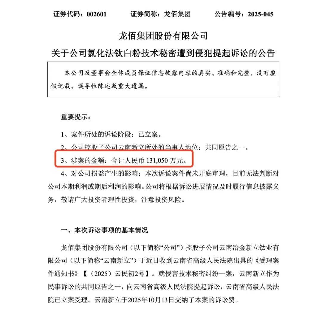 10月14日晚,龙佰集团公告,其控股子公司云南冶金新立钛业有限公司(简称“云南新立”)于近日收到云南省高级人民法院出具的《受理案件通知书》【(2025)云民初2号】。就侵害技术秘密纠纷一案,云南新立作为民事诉讼的共同原告之一,向云南省高级人民法院提起诉讼,云南省高级人民法院已立案受理。云南新立已交纳了本案的诉讼费。