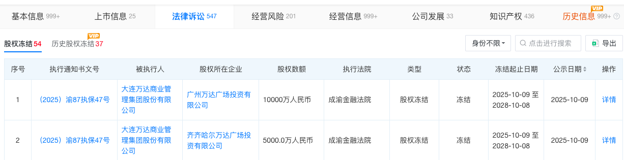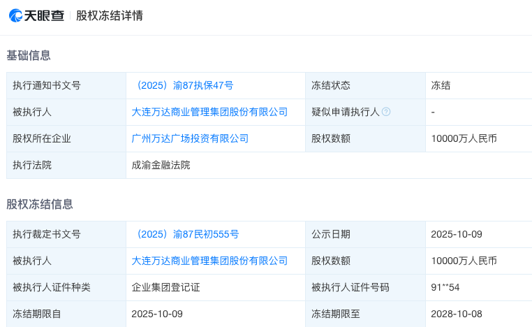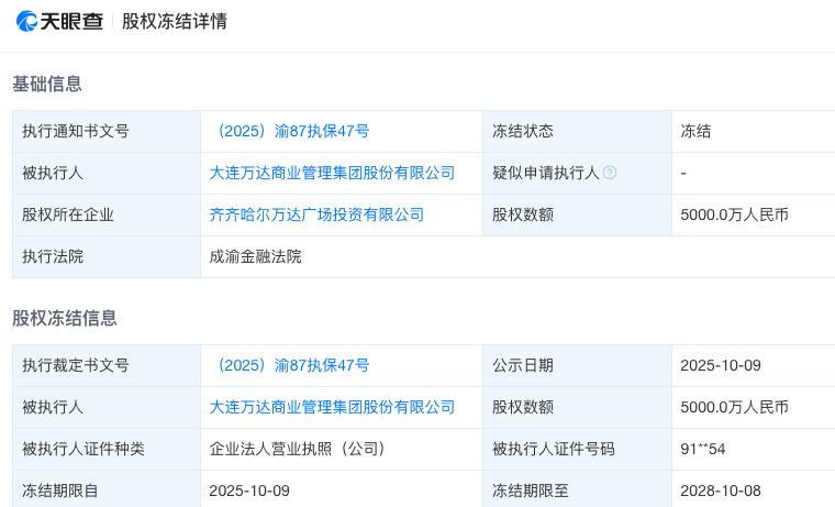 据天眼查披露的信息显示,10月9日,大连万达商业管理集团股份有限公司(万达商管)新增两则股权冻结信息,合计被冻结股权数额达1.5亿元,这一消息引发了市场的广泛关注。其中,股权所在企业广州万达广场投资有限公司,冻结股权数额为1亿元;股权所在企业齐齐哈尔万达广场投资有限公司,冻结股权数额为5000万元,冻结期限均自2025年10月9日至2028年10月8日,执行法院为成渝金融法院。