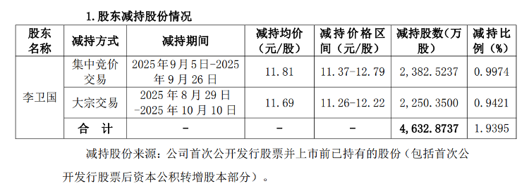 10月14日,北京东方雨虹防水技术股份有限公司(002271.SZ;简称“东方雨虹”)发布一则公告,将市场目光聚焦于实控人李卫国的减持动作上,引发了市场对东方雨虹股票的广泛关注。这份始于7月的减持计划,最终以远超市场预期的速度收官:仅用十余个交易日,李卫国便完成了4632.87万股的减持,占公司总股本的1.9395%,按公告披露的减持均价测算,李卫国本轮减持套现约5.44亿元。
