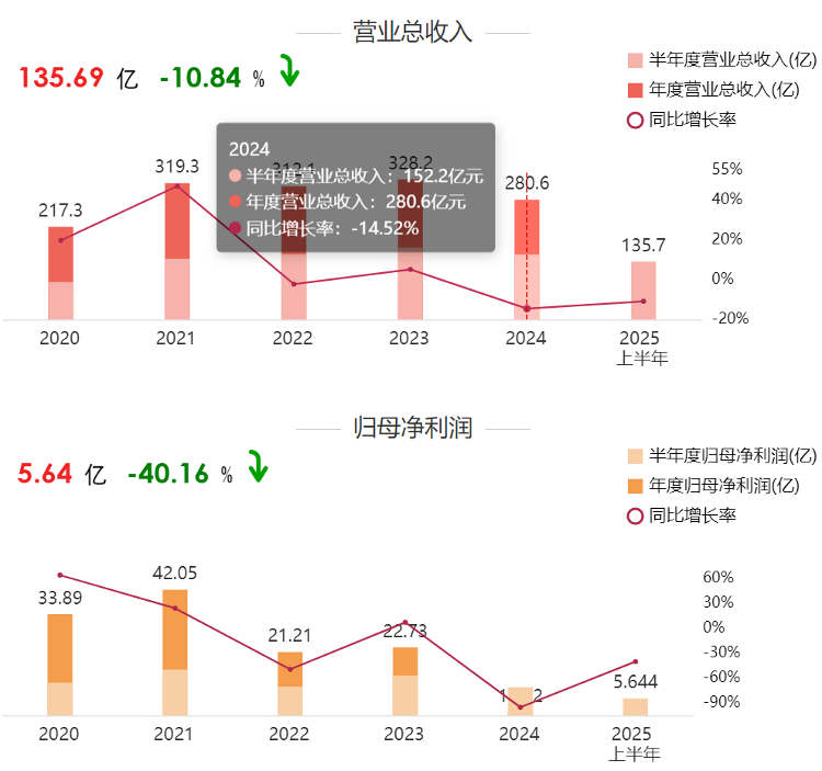 在公告中,东方雨虹对李卫国减持的原因写道:主要用于偿还债务。公司还表示,如本次减持实施完成,预计后续其质押率将进一步下降,从而能够显著化解其因前期质押率过高而带来的质押风险,本质上亦是降低公司的经营风险,帮助企业轻装上阵。记者注意到,对东方雨虹而言,公司的基本面与行业挑战备受投资者关注。从公开财报数据来看,作为防水行业的龙头企业,东方雨虹的营收规模仍保持行业领先,但增速已受行业周期影响有所调整。以2025年半年报为例,公司营收虽继续领跑,但营收增速较2024年同期有所回落,且营业收入和净利润均出现下降。2025年上半年,公司实现营业收入135.69亿元,同比下降10.84%;实现归母净利润5.64亿元,同比下降40.16%;扣非净利润5.07亿元,同比下降39.33%。