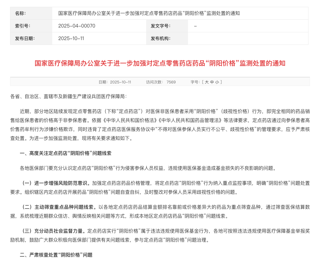 10月11日,国家医保局发布《关于进一步加强对定点零售药店药品“阴阳价格”监测处置的通知》,明确要求各地对“阴阳价格”行为严肃核查处置。此次新政直指“定点药店药品结算金额排名靠前”和“线上线下价格差异大”的药品,监管精度和力度空前。对于刚刚从2024年关店潮中缓过神来的上市药店公司来说,这套政策组合拳无疑是对其商业模式的又一次严峻考验。