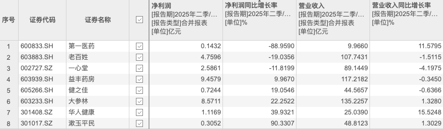 中国零售药店行业在2023年迎来巅峰后,2024年受医保政策收紧影响进入关店潮。尽管头部药店上市公司在2025年半年报中显示业绩企稳迹象,但随着第四季度政策环境变化,零售药店经营风险再次显现,行业增速放缓。根据申万医药流通“线下药店”细分行业分类,沪深两市共8家上市药店,分别为:漱玉平民(301017)、一心堂(002727)、健之佳(605266)、老百姓(603883)、大参林(603233)、益丰药房(603939)、华人健康(301408)、第一医药(600833)。