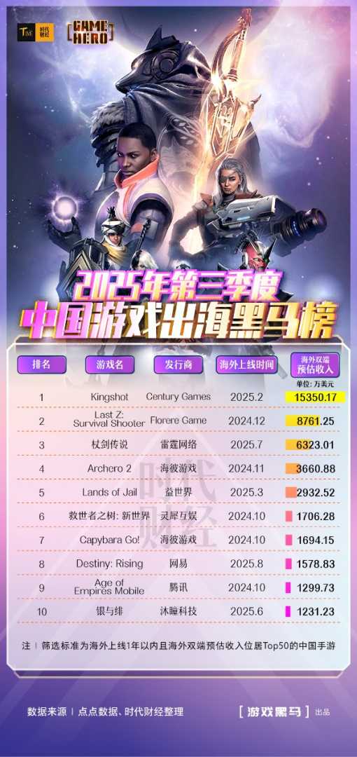 时代财经以上线1年以内且海外双端预估收入跻身Top50的中国手游为标准,统计并发布《2025年第三季度中国游戏出海黑马榜》(下称“《出海黑马榜》”)。