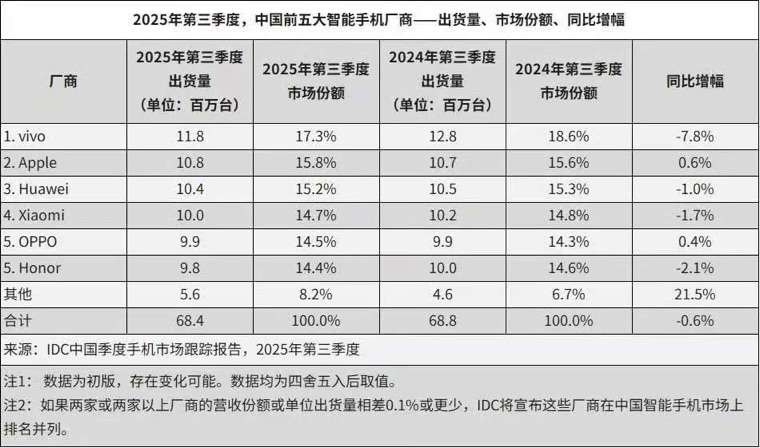 根据国际数据公司(IDC)最新季度手机跟踪初步数据显示,2025年第三季度,vivo手机以17.3%的市场份额位居中国市场第一,成为手机市场领头羊。苹果、华为、小米分别位列第二、三、四位,市场份额依次为15.8%、15.2%和14.7%。vivo近日发布的影像新旗舰X300系列手机,引发行业广泛热议,该系列手机有望进一步夯实vivo在中国手机市场的领跑地位。
