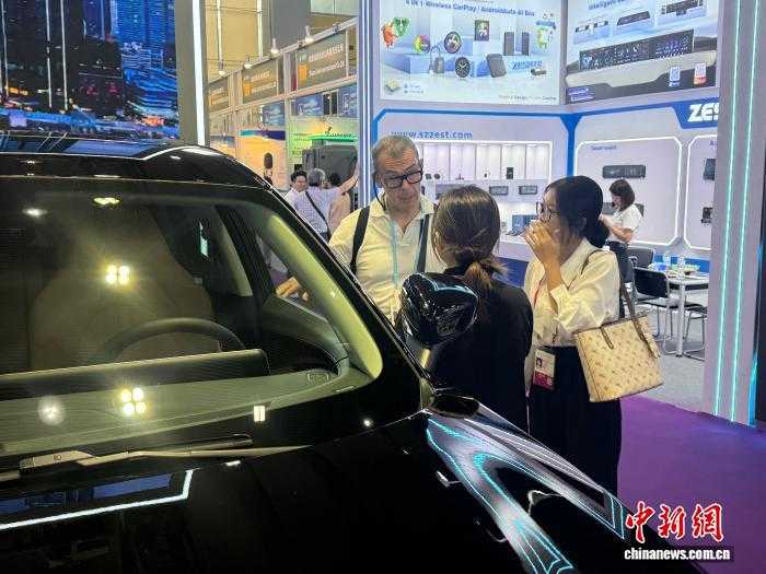 10月15日,广交会境外采购商在新能源车企前咨询产品。中新社记者蔡敏婕摄