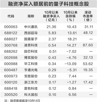 据证券时报·数据宝统计,A股中量子科技概念股共有38只。截至10月14日,10月以来,量子科技概念股获得融资净买入金额合计达到19.7亿元,18股获得融资净买入,中兴通讯、西部超导、国盾量子净买入金额居前,分别为21.36亿元、5.83亿元、2.37亿元。