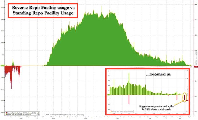 周三,美联储的常设回购机制(SRF)的使用量,罕见地攀升至了自6月(第二季度末)以来的最高水平。SRF是美联储在2019年那次流动性事件后引入的,旨在帮助缓解临时性货币市场压力,其使用量大增说明临时资金压力已超出市场自身调节能力。