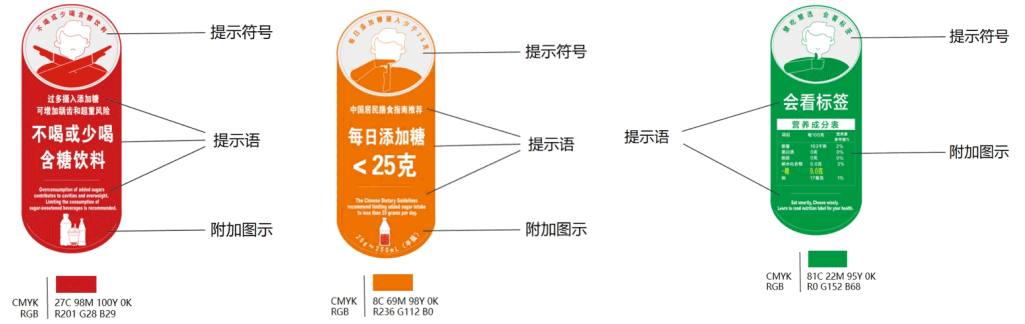 该征求意见稿提出了三款健康提示标识,分别为红色、橙色和绿色。红色标识建议“不喝或少喝含糖饮料”,橙色标识提醒“每日添加糖摄入少于25克”,绿色标识则指导市民“看懂营养成分表”,优化消费选择。