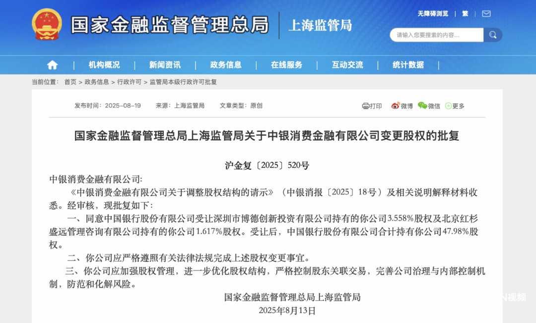 不过,2025年8月19日,国家金融监督管理总局上海监管局官网发布批复,正式同意股权调整方案。