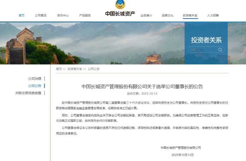 中国长城资产管理股份有限公司(下称“长城资产”)迎来新任掌门人,此次人事变动引发资产管理行业(AMC)的广泛关注。10月13日,长城资产官网发布公告称,经第二届董事会第三十六次会议决议,选举向党为公司董事长,其任职资格尚需金融监管总局批准。同时,向党不再担任长城资产总裁职务,在新任总裁履职前,由其代行总裁职责,确保公司经营正常运转。
