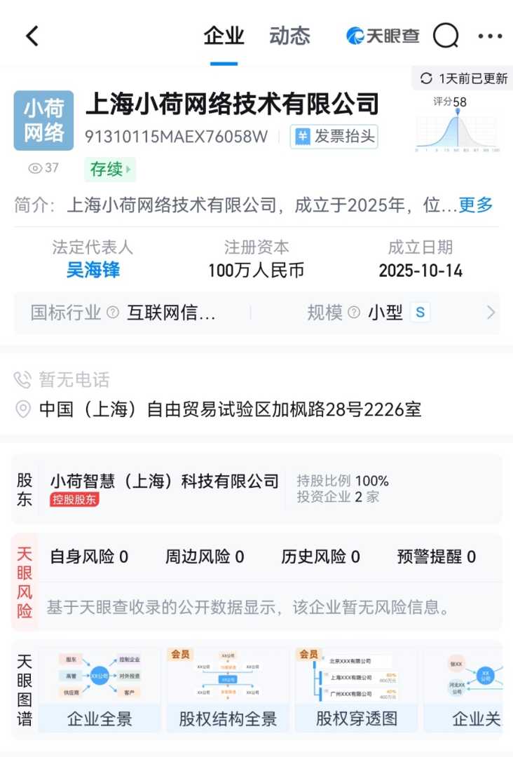 天眼查显示,上海小荷网络公司的法定代表人为吴海锋,由抖音集团间接全资持股。经营范围包括:互联网信息服务,药品互联网信息服务,医疗器械互联网信息服务,第二类增值电信业务,广播电视节目制作经营,食品销售等。