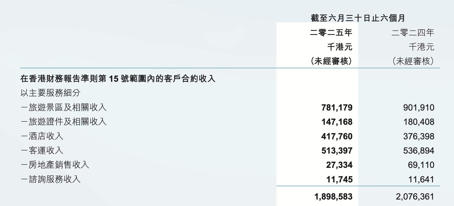公开资料显示,香港中旅隶属于中国旅游集团,1992年在香港挂牌上市,主营业务包括旅游景区运营、旅游证件服务、酒店经营及客运服务。地产业务为近年来拓展的新板块,却逐渐成为拖累业绩的“负担”。