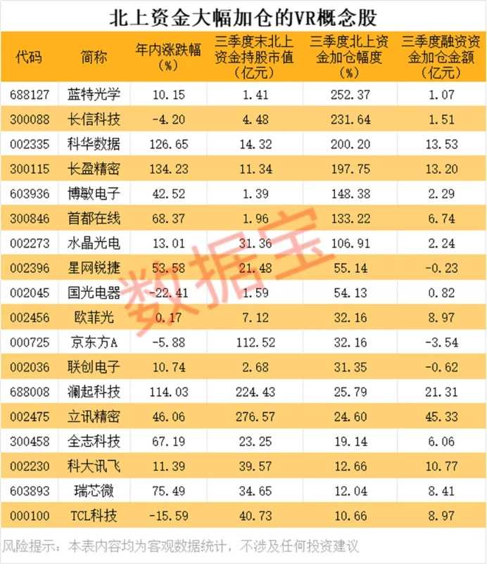 从资金角度看,北上资金三季度末持股市值超1亿元的VR概念股中,有18股在三季度获加仓幅度均超10%。蓝特光学、长信科技、科华数据、长盈精密、博敏电子、首都在线、水晶光电7只个股的北上资金三季度持仓翻倍。