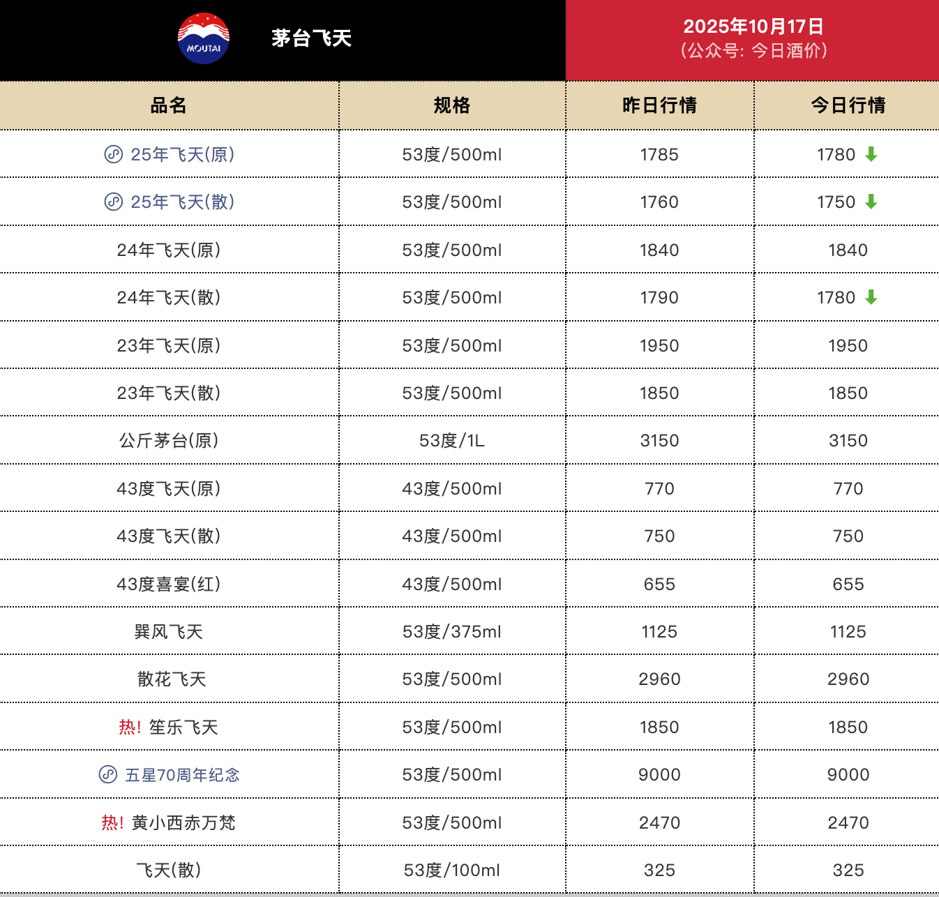 10月17日,25年飞天茅台原箱下跌5元,散瓶下跌10元;24年飞天茅台原箱持平,散瓶下跌10元。茅台价格波动反映白酒市场供需变化。