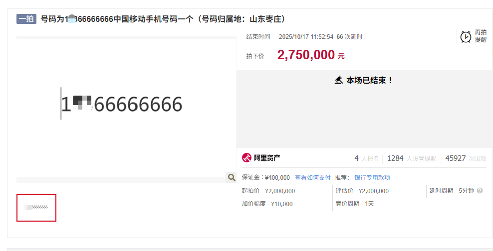 10月16日,备受瞩目的手机号“1**66666666”在阿里资产·司法平台正式开拍,该号码起拍价即达200万元,保证金为40万元,显示出其非凡价值。