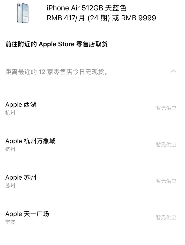 据都市快报报道,记者查询发现,目前杭州线下店已无货可取,仅可在线预购,交付时期已推迟至10月25日-11月1日。据界面新闻报道,京东平台上,Apple产品京东自营旗舰店内iPhone Air多个色系均处于无货状态,仅云白色iPhone Air 256GB版本支持预约抢购。