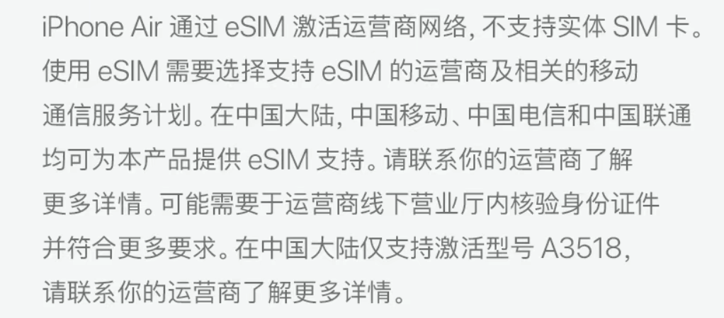 iPhone Air于今年9月苹果秋季新品发布会推出,与iPhone 17系列一同亮相。因其采用纯eSIM设计,无实体SIM卡槽,而当时中国大陆市场运营商虚拟SIM卡业务尚未开通,故未能与iPhone 17系列同期首发(关键词2:eSIM技术)。10月13日,中国移动、中国联通发文称,正式获得开展eSIM手机运营服务商用试验的批复,中国电信eSIM业务也于一天后正式开启。