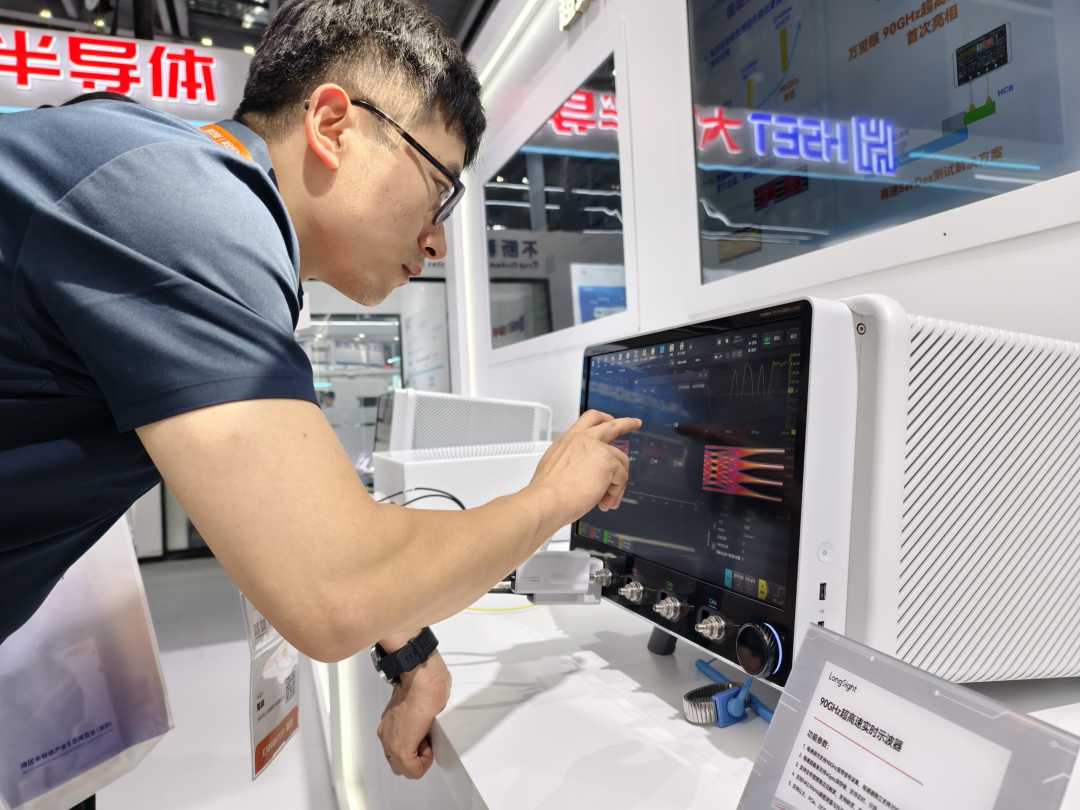 湾芯展现场千里眼展位一名工作人员正在操作90GHz超高速实时示波器。科技日报记者罗云鹏摄