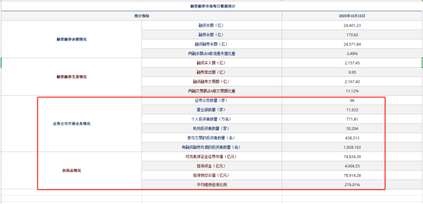 中证数据还显示,截至10月16日,两融市场中的个人投资者数量为771.81万名、机构投资者为50204家,参与交易的投资者数量为438313名,平均维持担保比例为279.01%,市场参与度极高。