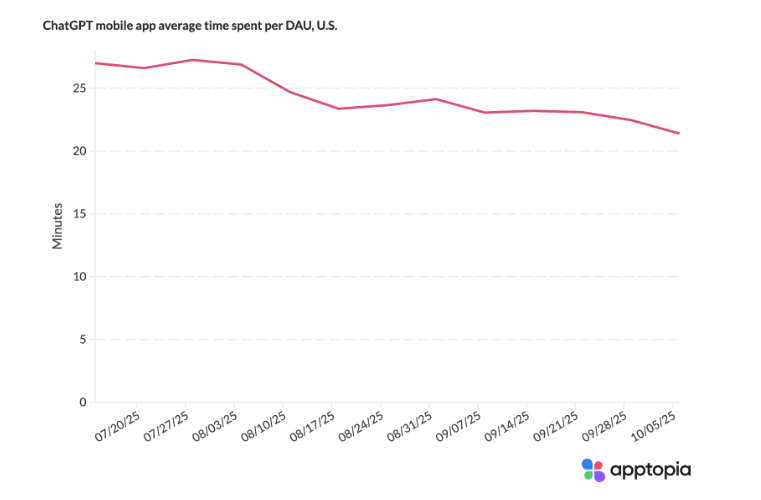 Apptopia深入分析其他指标发现,自7月以来,美国ChatGPT用户日均使用时长下降了22.5%,每次会话时长也减少了20.7%。